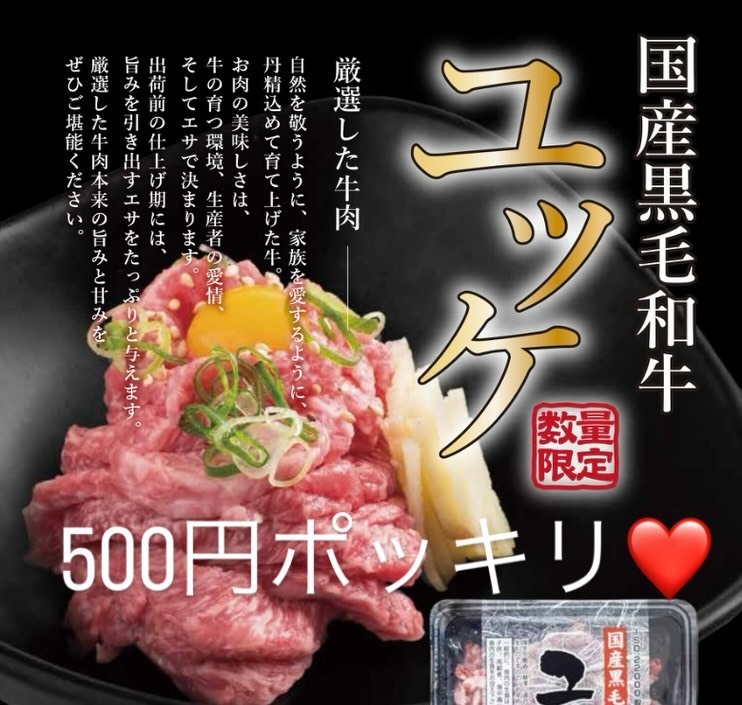 本日、特別なグルメ体験はいかがでしょうか。40食限定で、贅沢な黒毛和牛ユッケをなんとワンコイン、500円でご提供しております。お一人様につき一食までのご注文となります。本日25日はキャンセルが2件出ており、ゆっくりとお食事をお楽しみいただけます。この機会にぜひ、最高級のユッケをお試しください。